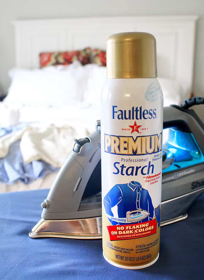 so how do i do it? there are three things you to make the best looking ironed clothes. a sturdy ironing board that has a flat, slightly padded surface and mesh board, a heavy iron with a steam setting and water sprayer, and Faultless Premium, the “starch that performs”. my husband especially loves starch. he likes that it makes his clothes look new, wear better, and feel better. plus, it reduces ironing time. great when you are in a hurry or have a ton of items to press.
