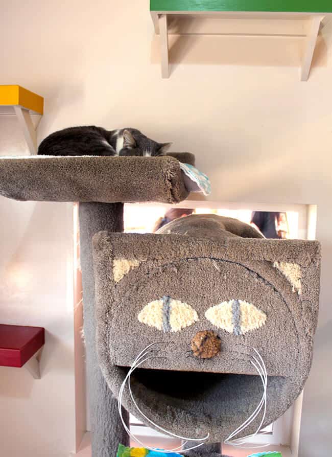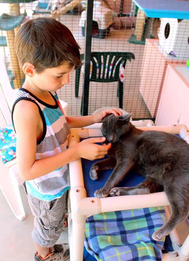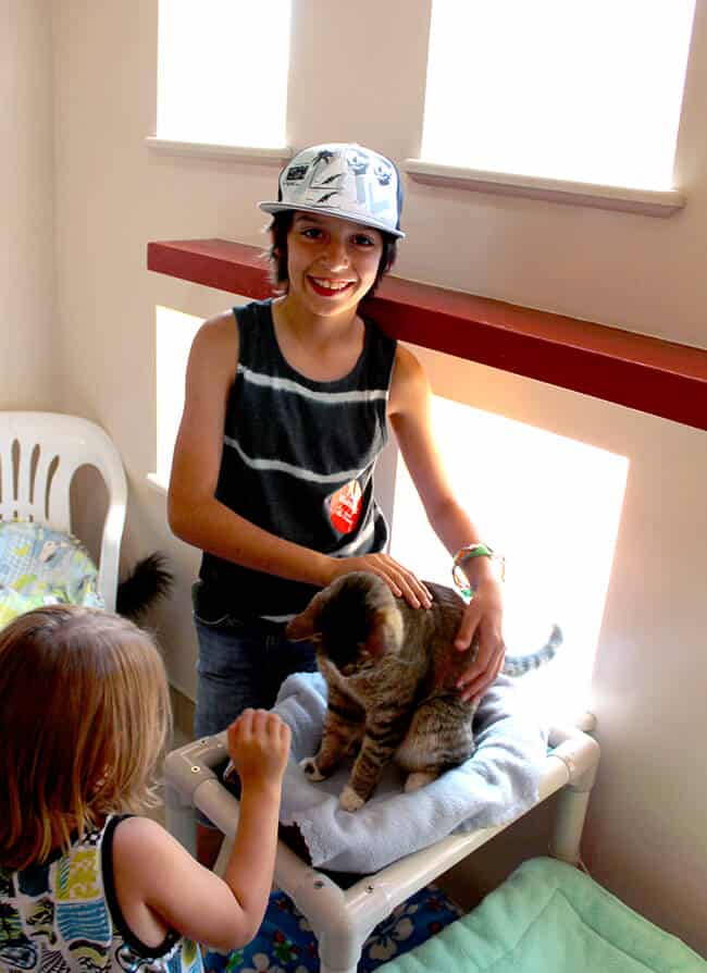 Cat World, like Dog Town, has many different buildings designated for different groups of cats with different needs. it was so heartwarming to see the boys pay loving attention to all the cats at the Sanctuary. they adore them.