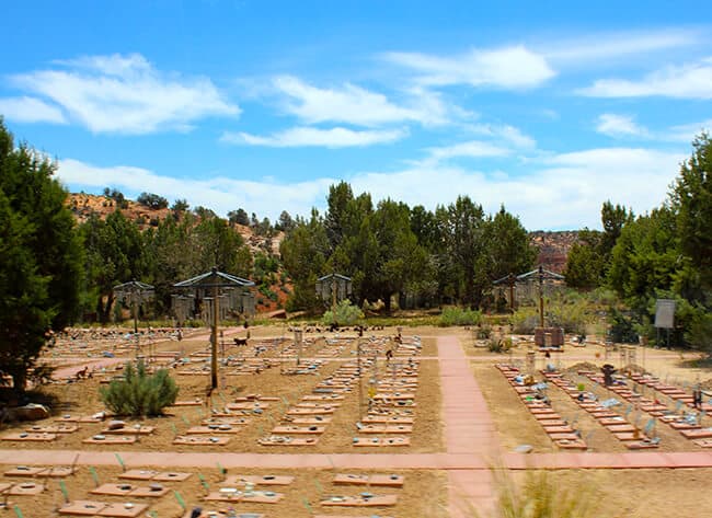 we also drove by Angels Rest, a final resting place for Sanctuary animals who crossed the Rainbow Bridge in the last few years, and cherished companions of Best Friends members and staff. Angels Rest and Angels Overlook are celebrations of the everlasting bond that we share with animals. it is one of the most peaceful and serene places that can be experienced. surrounded by the beauty of Angel Canyon, the musical sounds of wind chimes ring with the slightest breeze. each marker is evidence of the love we hold for our pets. a visit to Angels Rest stirs emotions and kindles memories of our past animal friends. visitors can pay their respects to past Sanctuary friends or walk the meditation labyrinth, designed by Best Friends co-founder Cyrus Mejia.