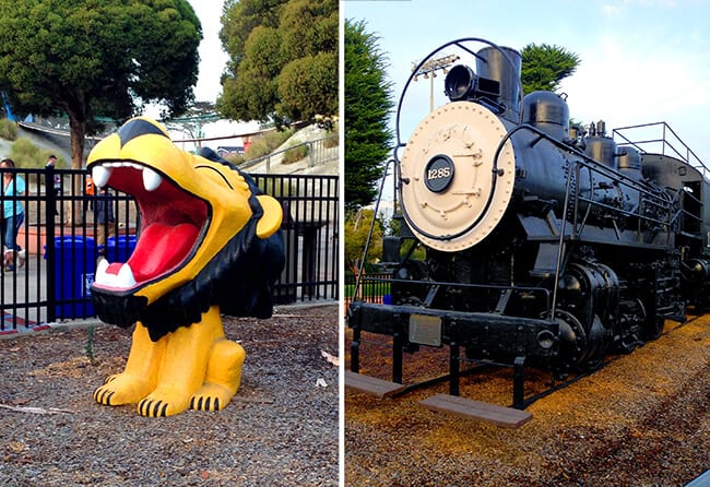Two more original historic features of the Dennis the Menace Park still reside onsite. A old lion that was the original lion water fountain, and Steam Engine 1285. Park visitors used to be able to climb and play on this steam engine replica, however due to safety concerns, it is currently fenced off.