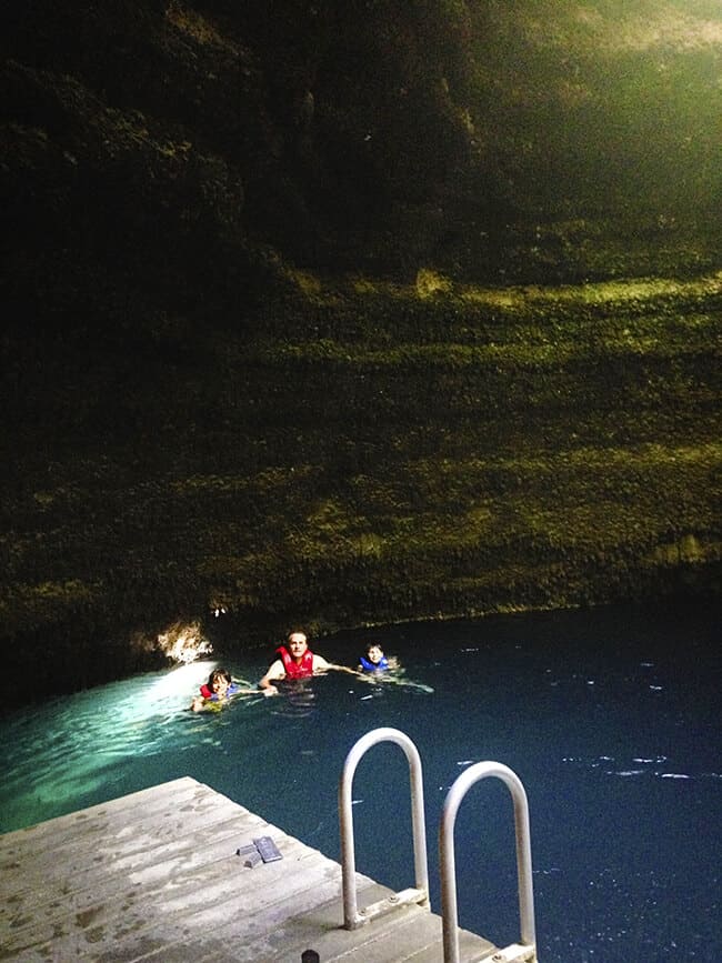 my husband and older son were most excited to jump right away into the water. it is dark within the crater (the do have dim lights on), which was a little creepy to my younger boys. my youngest son, Vann, decided he didn't want to swim.