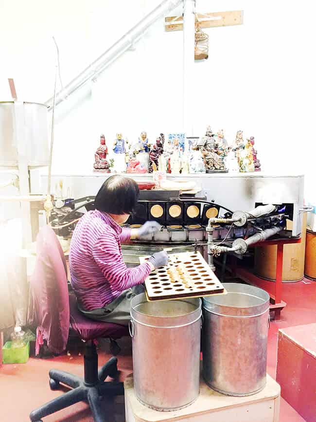 you get to see the entire process, from batter to fortune to folded cookie. first, the thin circular cookie is pulled off a hot press. next, a fortune is placed on one side of the hot, flat dough.